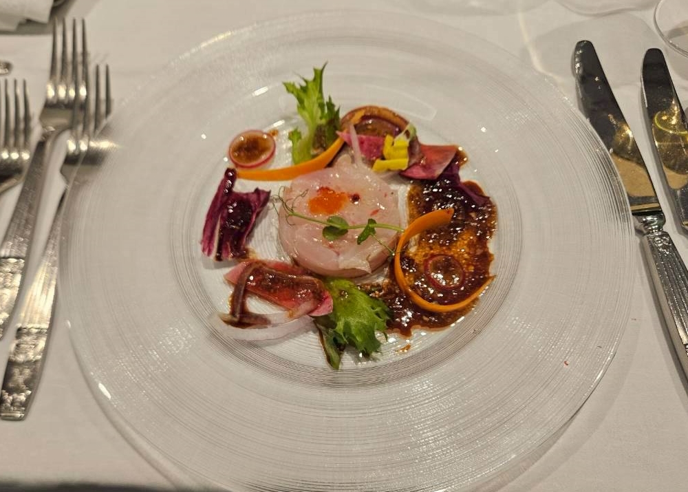 シャンパーニュにはぴったりの「鮮魚と彩り野菜のカルパッチョ バルサミコビネグレットソース」が出て、