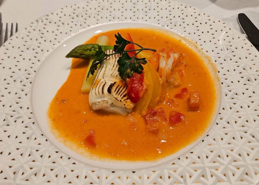 「スズキのムースリーヌと海老の白ワイン蒸し ジョルジュブランソース」が出て、