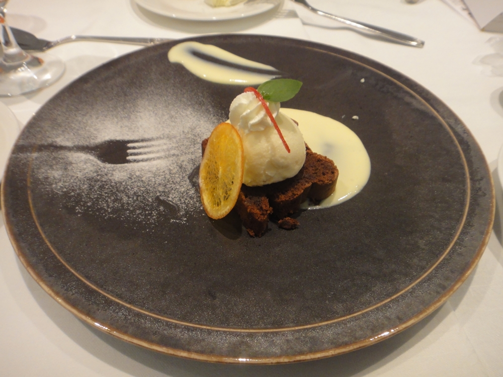そしてデザートは「オレンジとショコラのガトーテリーヌ バニラアイス添え」が出て、