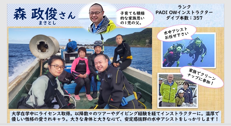 インストラクターになってから早20数年!宮城県在住ながら夏の週末などにはパスキーに通う熱血派! 学生時代からダイビングに目覚め、卒業前にモルジブに行ったほどの行動力の持ち主。 本職の営業畑の実力を遺憾なく発揮し、お客様への受けのよさと付き合いのよさはパスキー随一。 2018年7月には子連れで5度目のモルジブも堪能! これからも世界の海で潜りまくりたい、中堅インストラクター。
