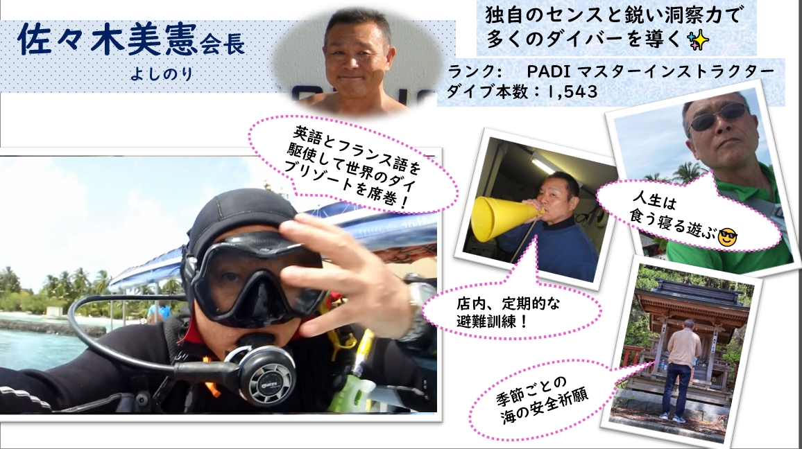 会長職に退いたとは言え、自宅で家事と雑用もこなす傍ら、各種上級ダイバーを厳しく指導。 モルジブをこよなく愛し、いつもは年に数回もモルジブツアーを組むほど。 留学経験もあり英仏語には堪能。