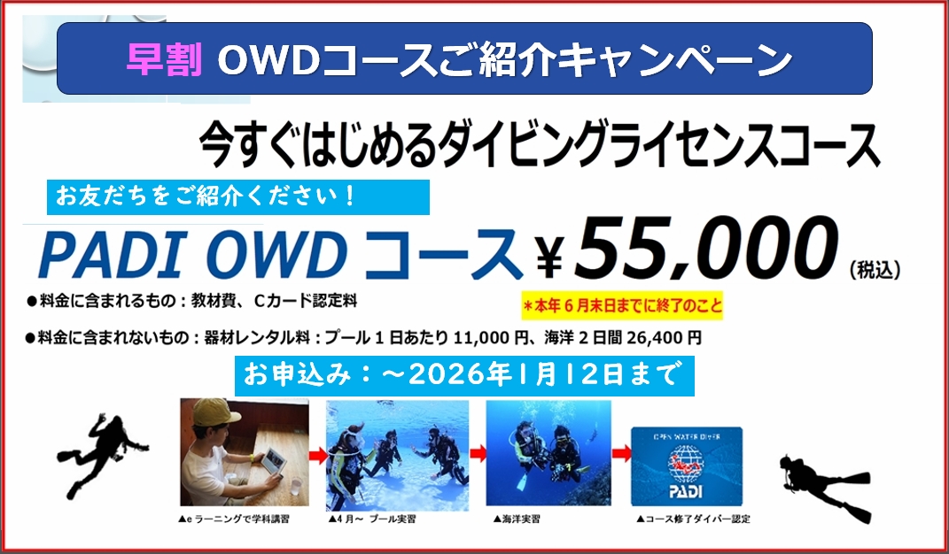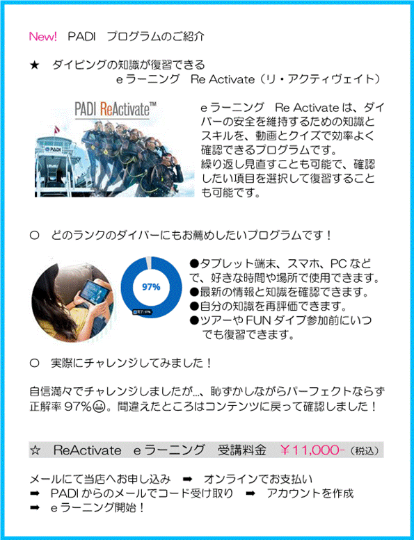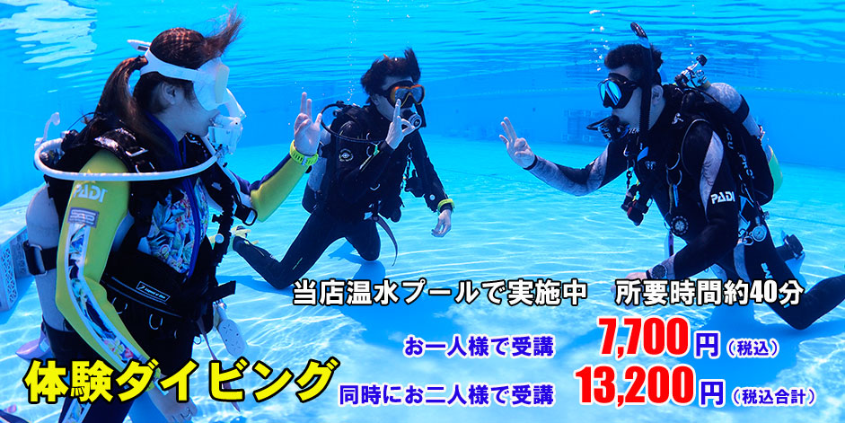 店内に温水プールを完備し、全く初めてのOWDコースからプロコースまで、各種ダイビングコースを開催中です。