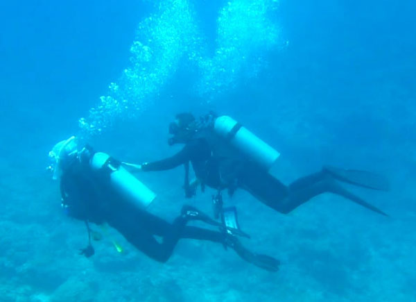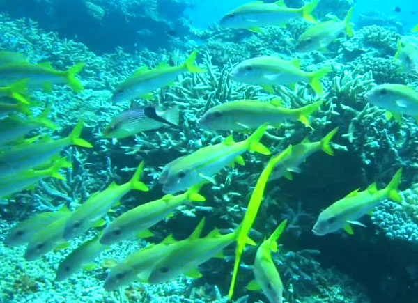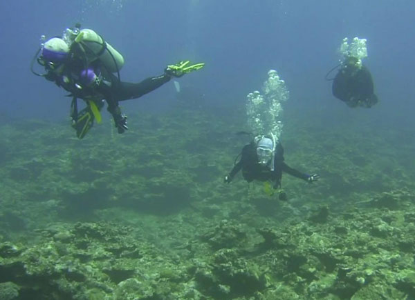昨晩は隣にできた「ふくぎ」と言う居酒屋に出かけた。 島のリゾートの板前さんが独立したお店とのことで、おいしい料理が沢山並んだ。 3日目も好天で、1本目は細崎(くばざき)の漁港から30分ほどの西表島の真北のポイント、 バラス島の西側のカスミの根に出かけた。 ここは潮通しもよくアカヒメジなどの小魚が綺麗だった。 その後のお昼の時、メンバーが「ウミガメが見たい」と言ったことから、 2本目は島の西側、ヨナラ水道の「ヨナラプール」に行くことにした。 ラッキーにもここでは希望通りにサメにカメにイセエビと、 大物や縁起物を見ることが出来て大喜び! さすが「強運のパスキー」だ。