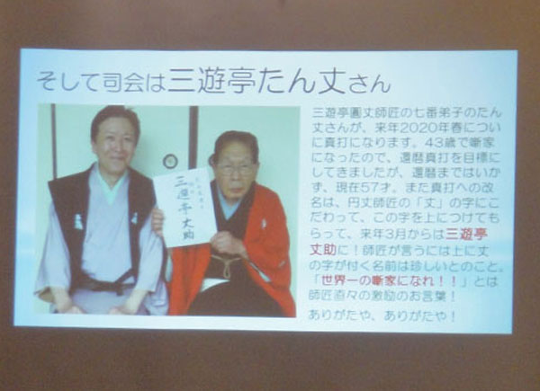 弊社社長のウエルカムスピーチ、MCの三遊亭たん丈さんの紹介と続きました。