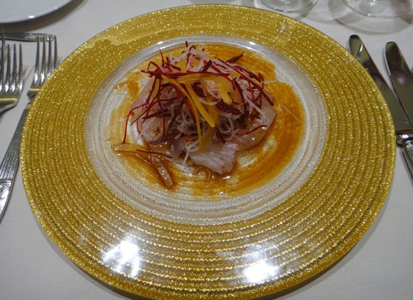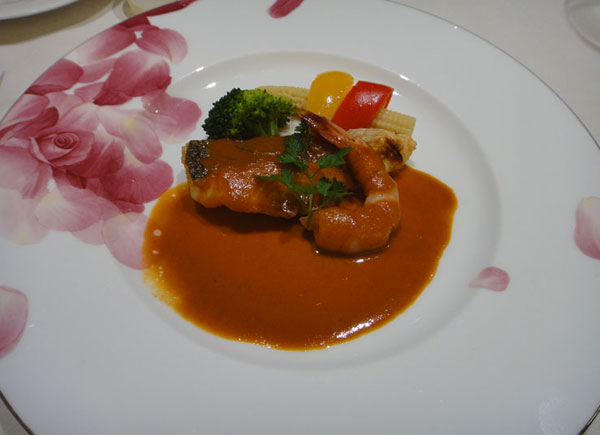 その後は魚料理の「すずきと海老のオリーブオイル焼き、甲殻類のソース」が出て、